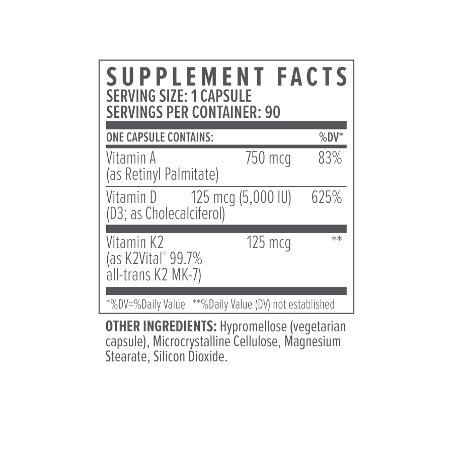 Biote ADK 5 includes vitamin A as retinyl palmitate, vitamin D3 as cholecalciferol, and vitamin K2 as menaquinone-7. Each capsule contains 5,000 IU of vitamin D3.